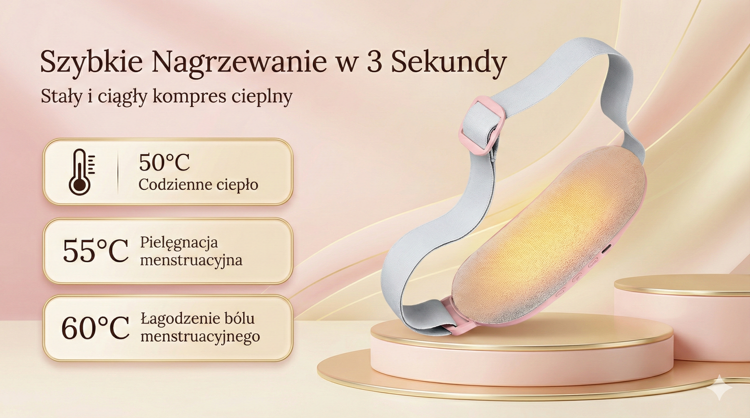 Bezpieczeństwo to nasz priorytet.Pas Femmi wyposażony jest w inteligentny system kontroli temperatury, który zapobiega przegrzaniu. Mimo to, dla zachowania najwyższego komfortu i ochrony wrażliwej skóry, zalecamy stosowanie pasa na cienką warstwę odzieży (np. podkoszulek lub body), a nie bezpośrednio na nagie ciało – szczególnie przy wyborze wyższych trybów grzania (55°C–60°C).